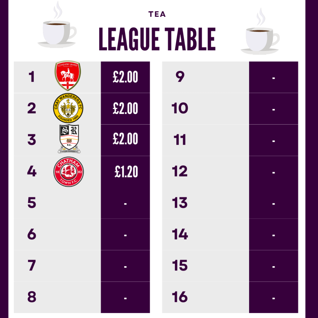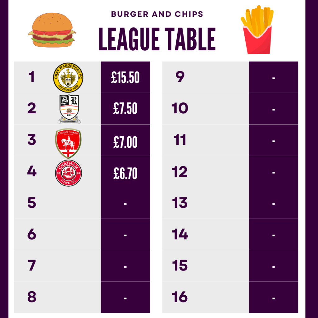 Now lets now take a peek at the Fab 4 prices for Stafford, taking our league table from 3 to 4 teams we can start to see the table take shape, anyone else really fancy burger and chips now….