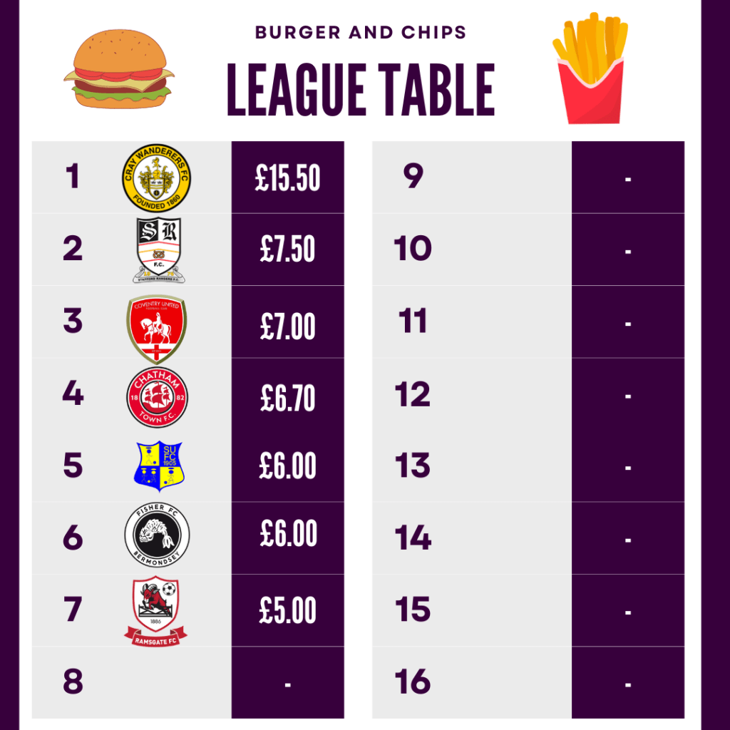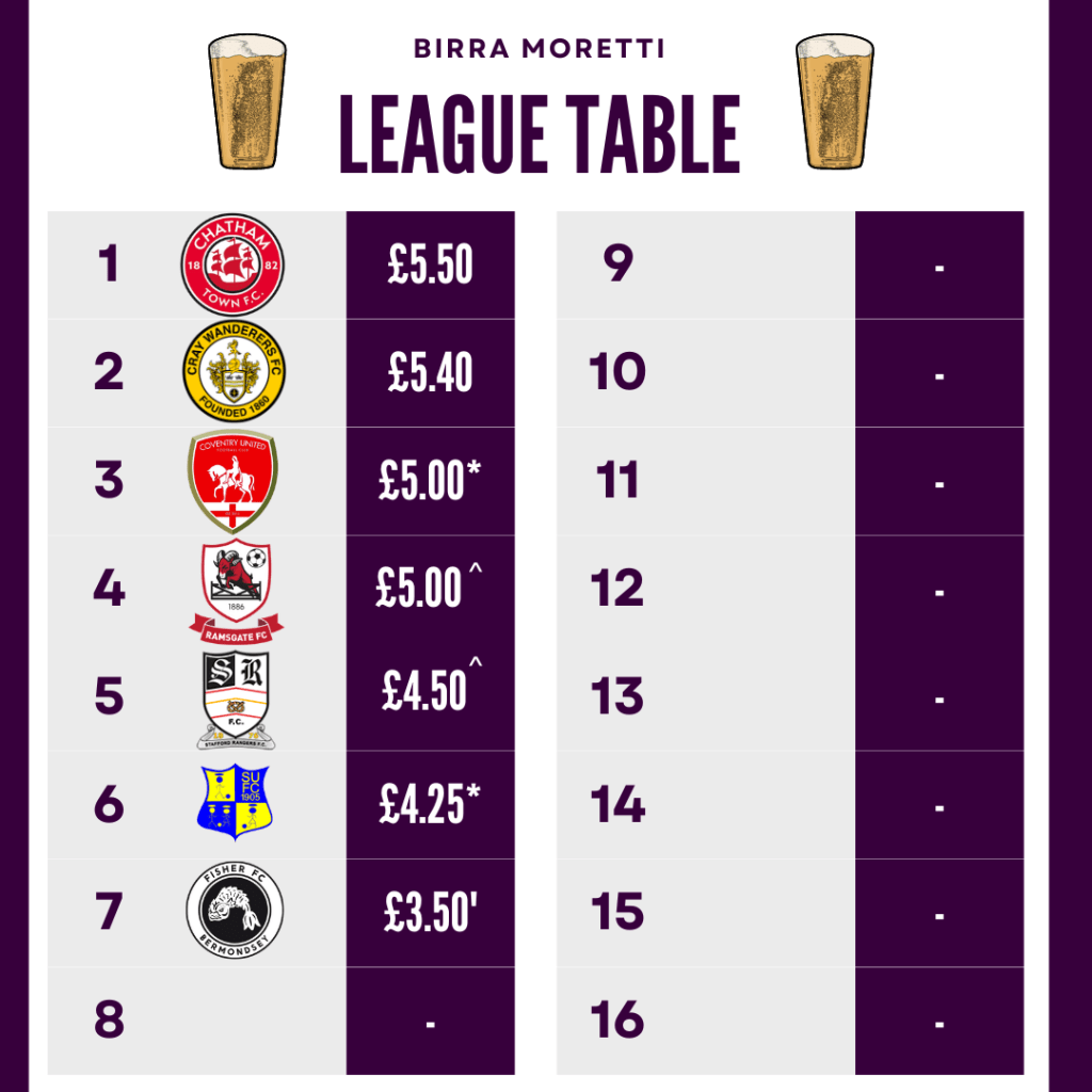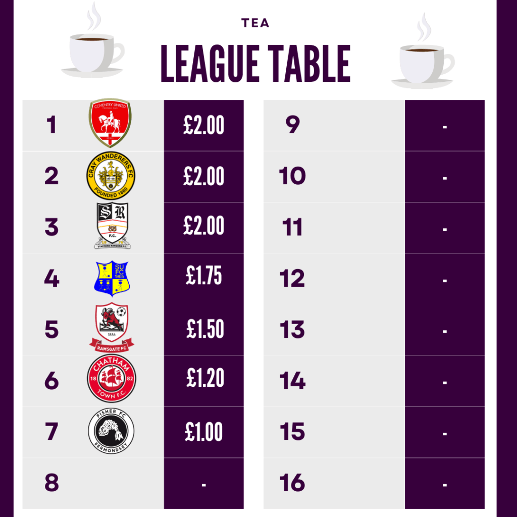 As you can see the matchday prices on offer from Fisher FC are incredible value for money, especially considering they are a London based team. The drinks are extremely well priced and even more so if you are someone who enjoys local produce or someone who likes a hot brew. At just £1 f0r a cup of tea the club have taken the lead from Chatham Town who have held that position since week 1 !