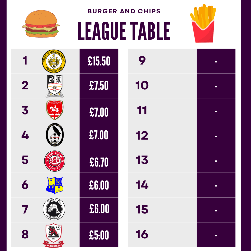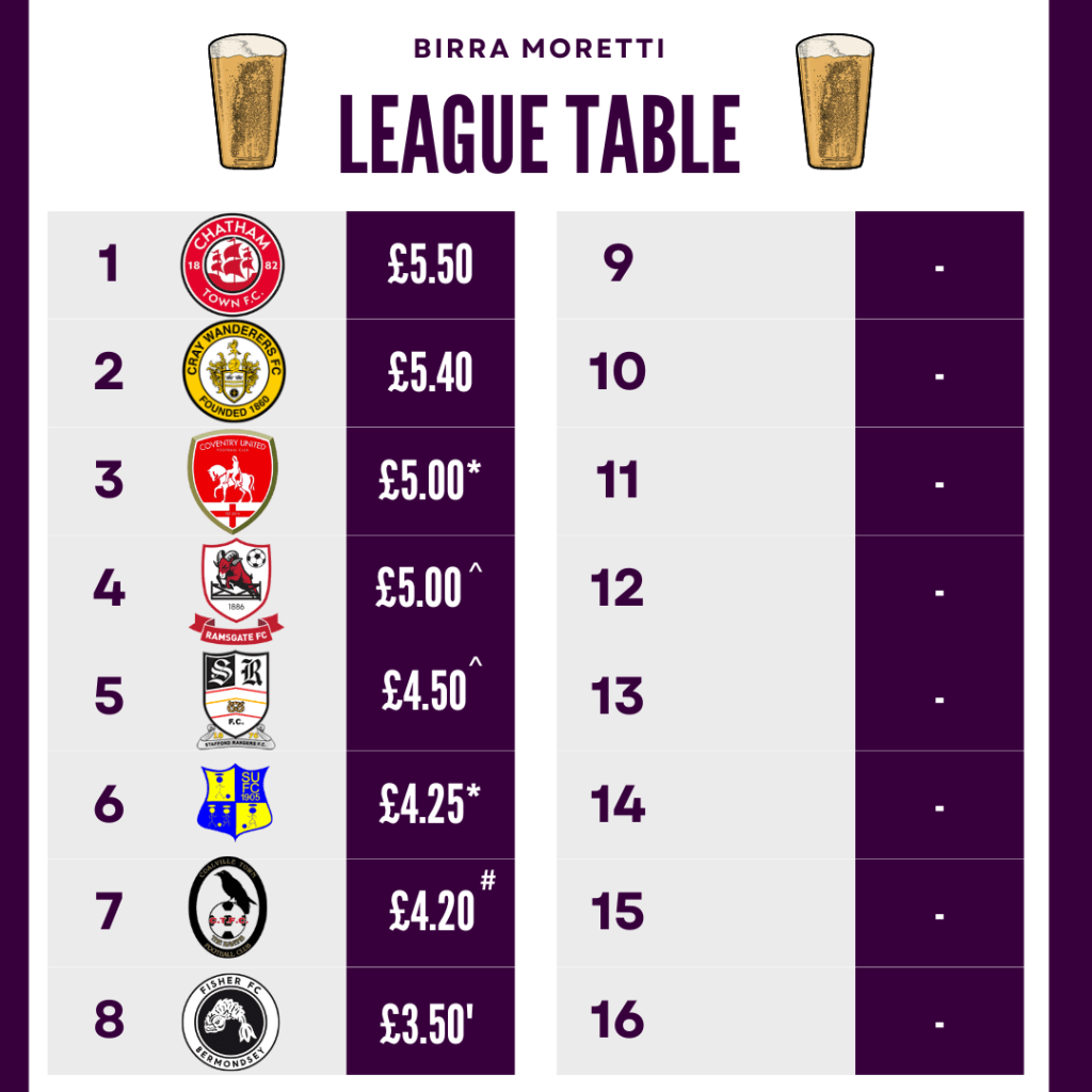 Now let’s now take a peek at the prices of 4 of the most popular items bought by fans on a matchday: Beer, Cider, Burger and Chips and a cup of tea: