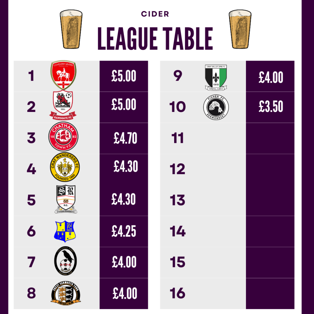 Now lets all gather round and have a little look as to where Cray Valley PM sit on our food and drink league tables.
