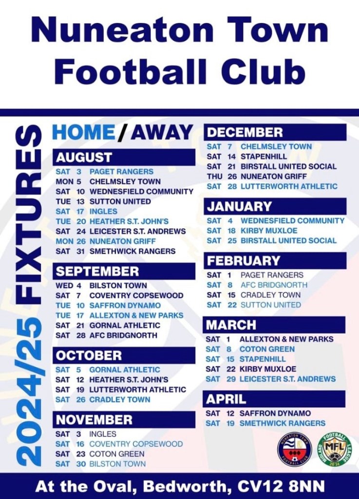 Looking to visit the new Nuneaton this season then here you go, a full fixture list with plenty of cracking ties to choose from. Get yourself down to a game and enjoy the rebirth of this amazing team.