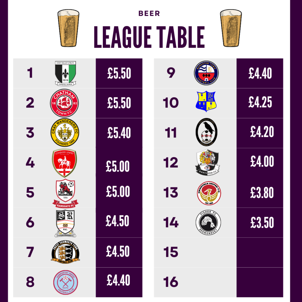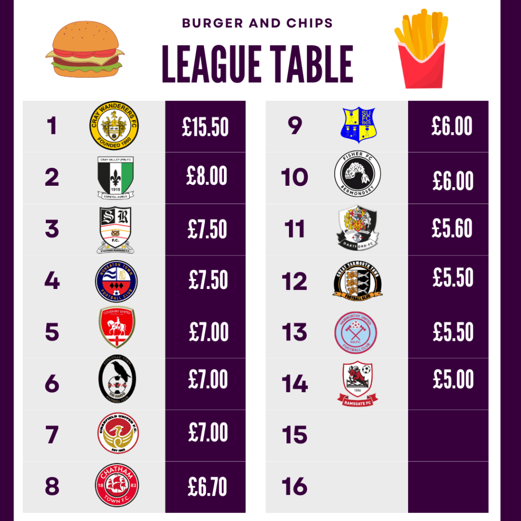 Due to not owning their ground the club do not have full control over the prices of the drinks and food on offer for a matchday. However the overall costs for our 4 league tables are competitive and especially when you see the quality of the burger and chips very much worth the cost associated.