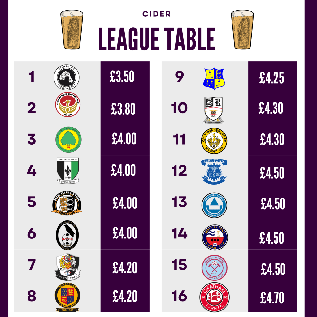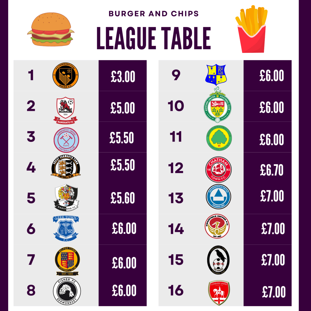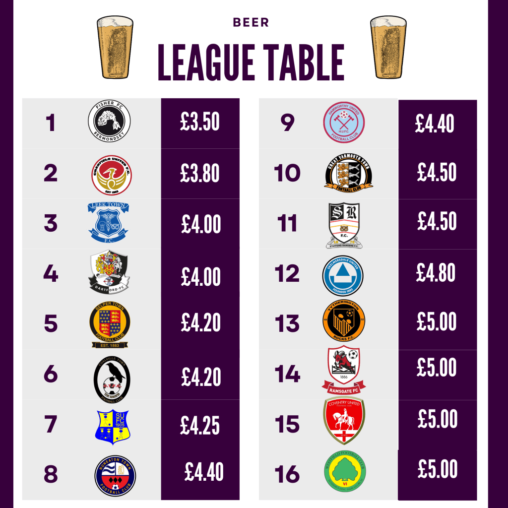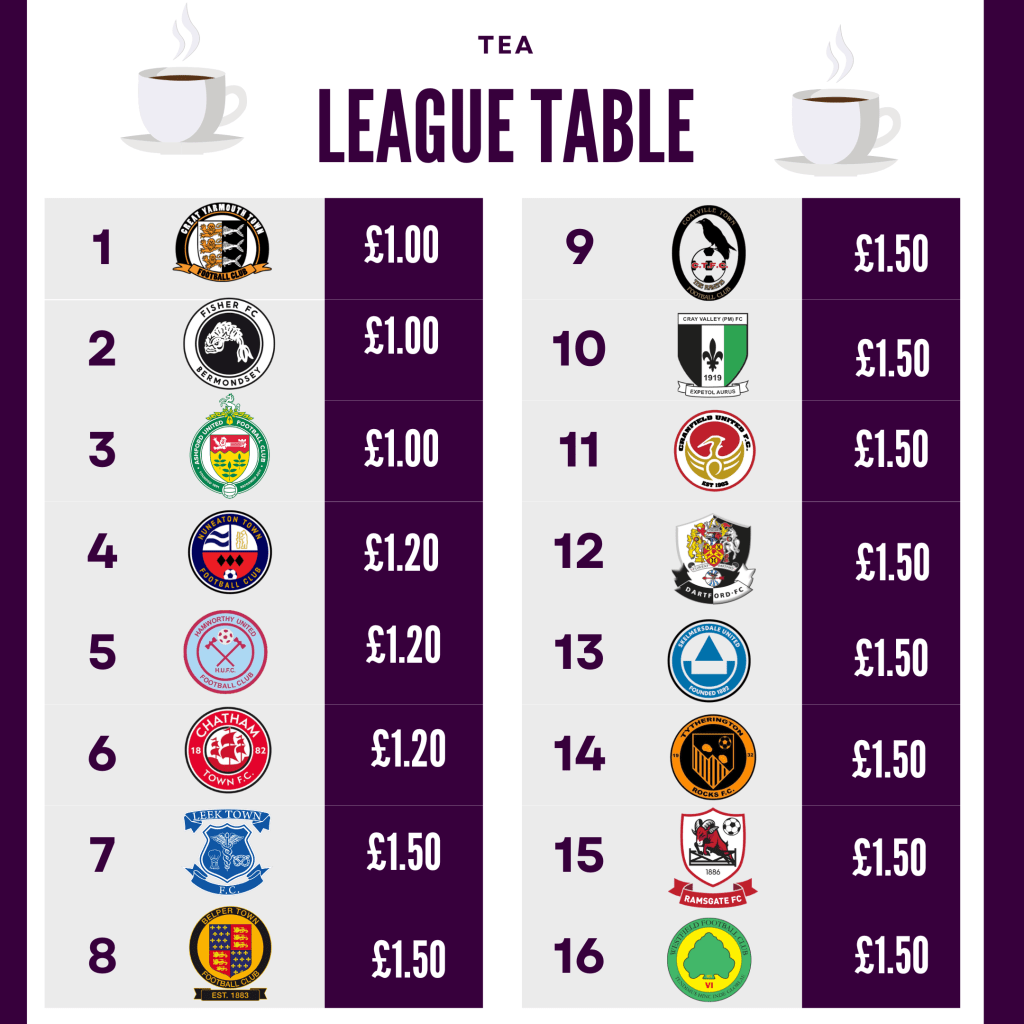 Firstly, Leek Town make onto all of the 4 different league tables and make noteable moves on the Beer table, coming in at joint 3rd with just £4 a pint, alongside Dartford FC, cracking value for money. The what seems to be staple price of £1.50 for a cup of tea and the very good value of just £6 for burger and chips.