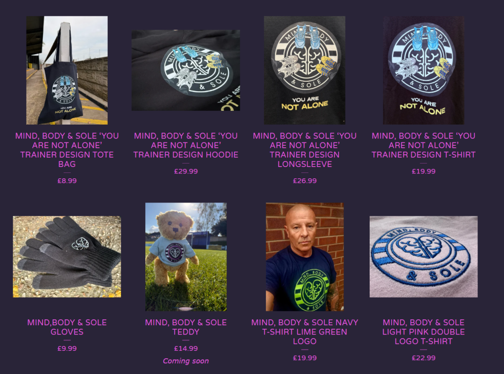 Our merchandise has grown from matching T-shirts with your trainers to football designs to mental health messages.