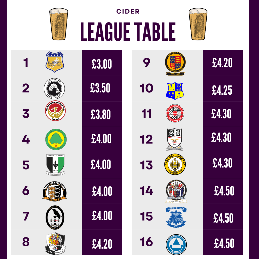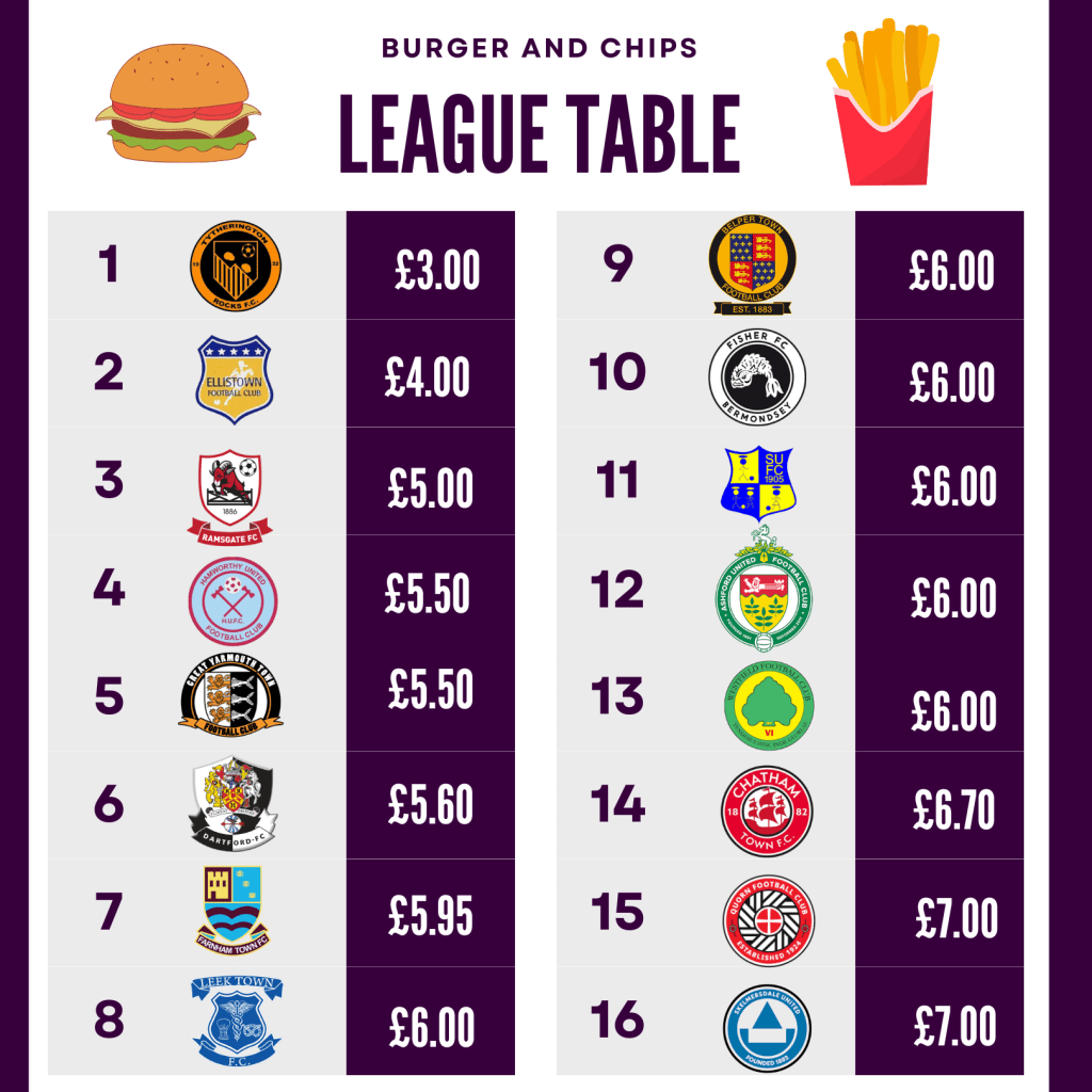 Unfortunately Billericay slightly miss out on 3/4 of the Fab 4 tables with their only entry being their £1.20 offering for a cup of tea.