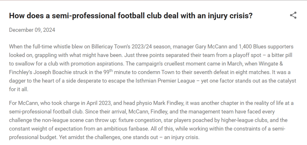 The other articles that stand out are my feature with Billericay manager Gary McCann and physio Mark Findley, discussing the impact of injuries on the semi-professional game. My piece about Leyton Orient, published by The Lower Tiers and in the Pandemonium Fanzine, was also enjoyable to write.