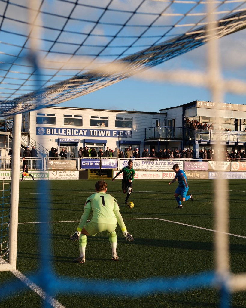 In terms of the photos I’ve taken, my favourite so far is one I took at Billericay Town vs. Cray Valley in February 2025 where I framed a piece of match action in one square of the goal net. The light is superb, lighting up the clubhouse and casting long shadows. Also, it features a Cray Valley player who I’m a big fan of – all-action centre-back Kiki Oshilaja who’s since gone on to play at a higher level – who’d stormed into the Billericay penalty area.