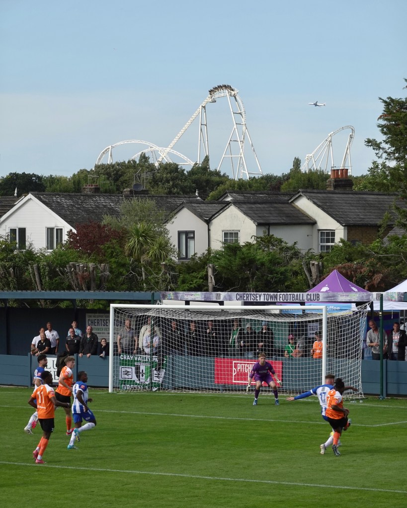 If I choose to capture match action it’s almost always secondary to other elements within the photo, such as fans, and/or an interesting backdrop such as the architecture of the ground or the landscape beyond it. A prime example is the photo I took at the Chertsey Town v Cray Valley match earlier this season with the huge Thorpe Park rollercoaster in the background!