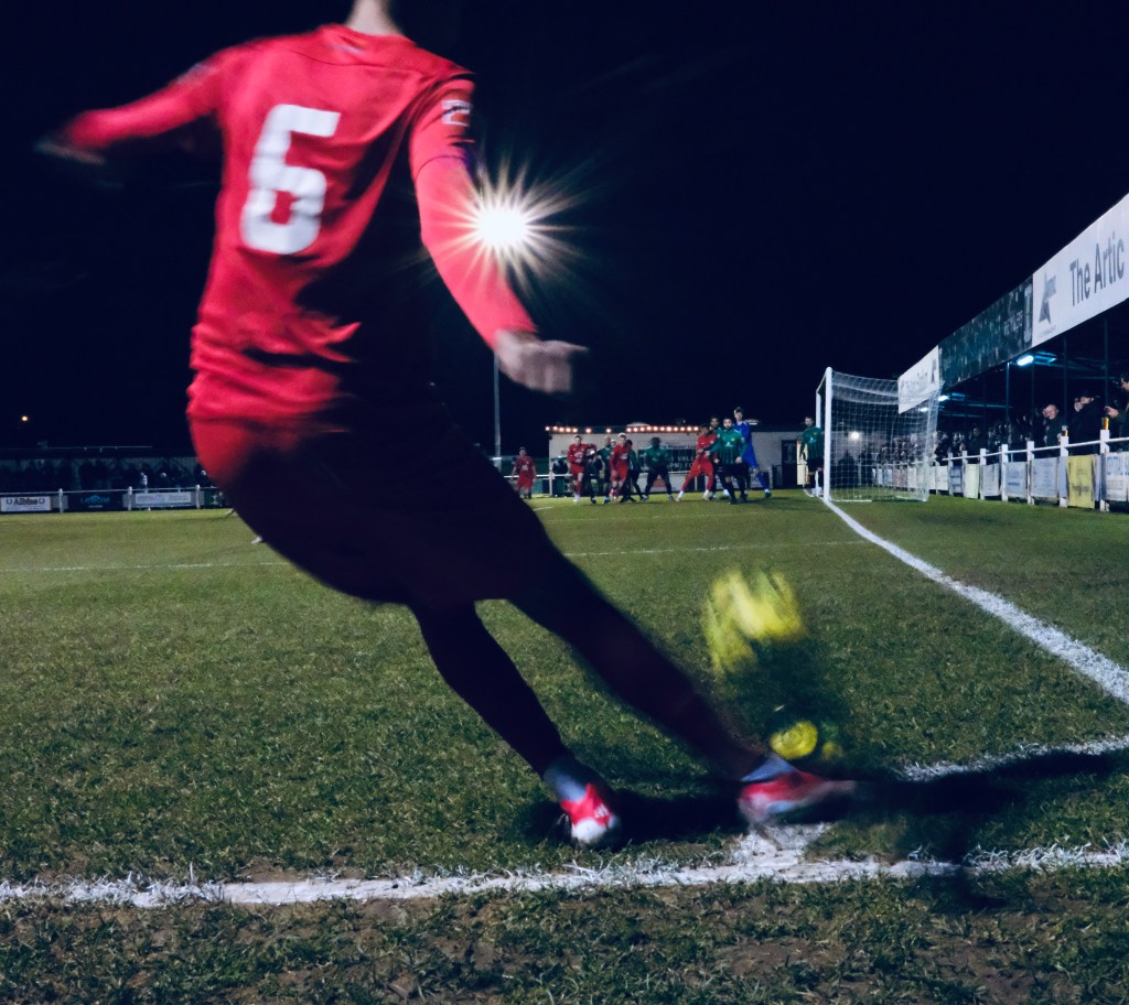 Another example is at a Cray Valley home match last season where I took photos of match action using a narrow aperture to get an interesting star effect from the floodlights, and a slow shutter speed to get sufficient light into the shot as well as motion blur. I ended up getting a really wacky photo of Lewes player Marcus Sablier taking a corner kick.