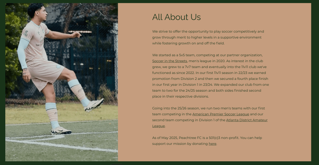 I moved back to Atlanta in 2020 and wanted to continue playing soccer after having a great experience playing in New York City for New York International FC. I struggled to find a team that had similar professional standards at an amateur club and having been part of the 5-a-side StationSoccer team with growing interest, I decided to pursue the goal of starting my own 11-a-side team in Atlanta that had professional standards while still being an amateur side. We grew from that 5v5 team to two 7v7 teams and in 22/23 season started our first 11v11 team in ADASL. We were promoted from Division 2 to Division 1 in our first year, finished 4th in our second year, started our second team in year 3 with both sides finishing 2nd place in their respective divisions, and this year we have our first team playing semi-professionally in APSL and our second team playing in the first division of ADASL.