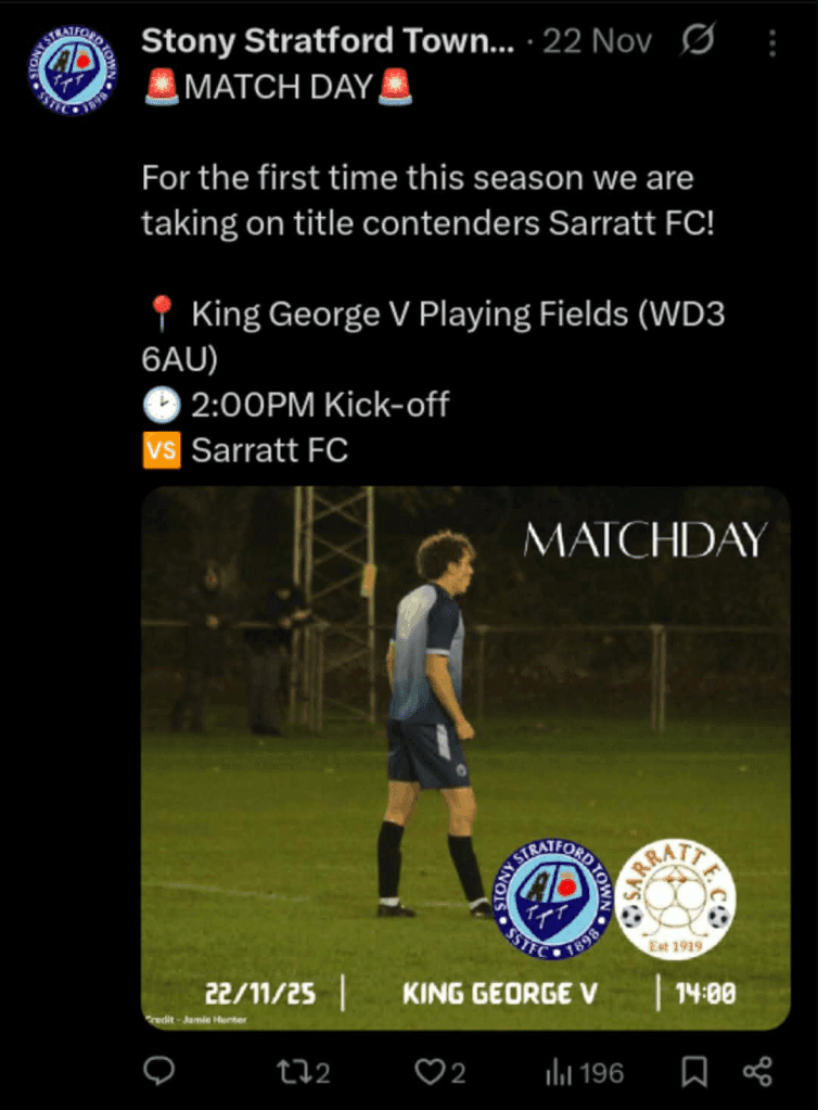 I try to use X as much as possible with multiple days of build up posts, interviews and highlights to try to get more eyes on the club in the hope that it will get a handful more people down at the club. I started regularly posting to the club's YouTube and even founded the TikTok account to try to keep a consistent audience engaged with the club. I find just regular posting on X keeps the audience we have the most captivated